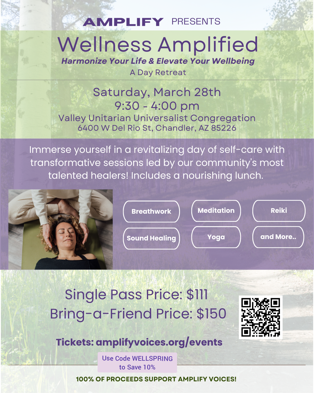 Immerse yourself in a revitalizing day of self-care with transformative sessions and a nourishing lunch. The Welcome Wellspring is collaborating for this special day retreat, which is a fundraiser for the important non-profit work of our Wellness Partner, Amplify Voices. Thank you to our partners Health Destination, Sounds by Stu, and Mobile IV for contributing to this event!