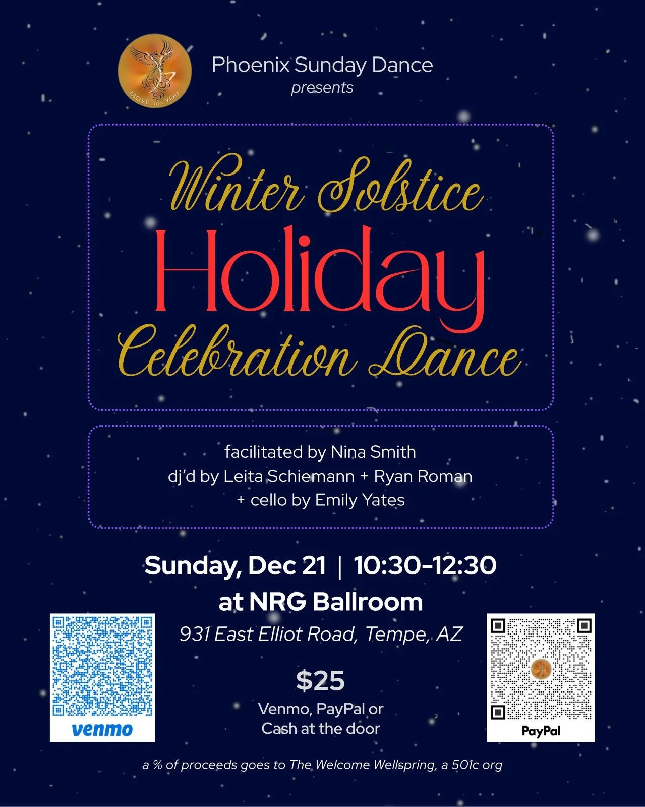 To register: Send payment directly to Phoenix Sunday Dance/Nina Smith. VENMO - @ninasMyth or PayPal.me/PhoenixSundayDance. You can also pay at the door. If you have questions about this event, contact Phoenix Sunday Dance via text or voicemail (480) 779-8238